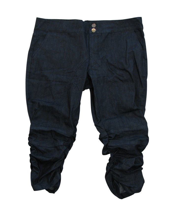 Buksebenene er afsluttet med rynkeeffekt på både inderside og yderside. Dette giver en flot detalje til pasformen. Bukserne har mange flotte stiklinger på benene, som får benene til at se tyndere ud. I linningen er der to knapper og lynlås.