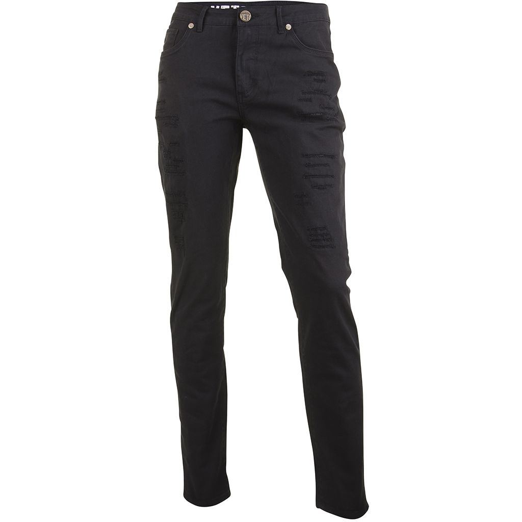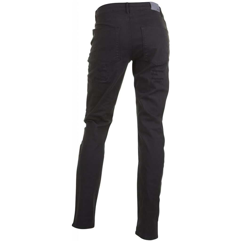 Jeansene lukkes med en knap og lynlås. Rundt i linningen er der bæltestropper. Foran på jeansene er der lavet slid, men på indersiden er der påsyet et stykke sort stof, så sliddet ikke gør, at man viser bare ben.