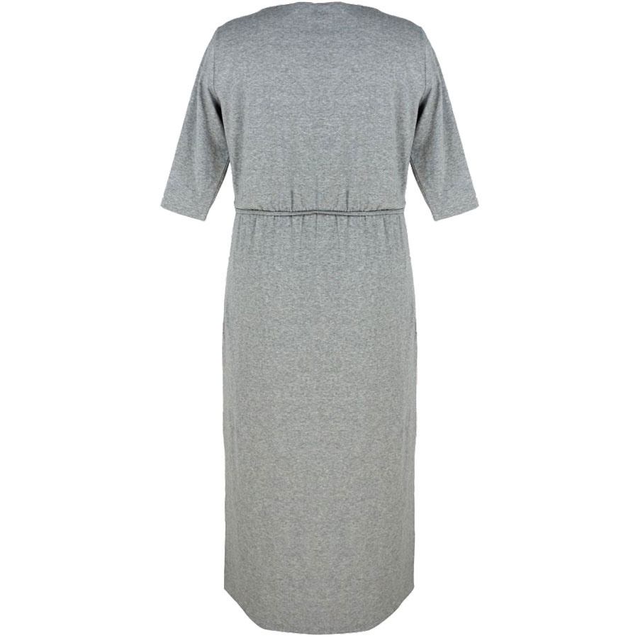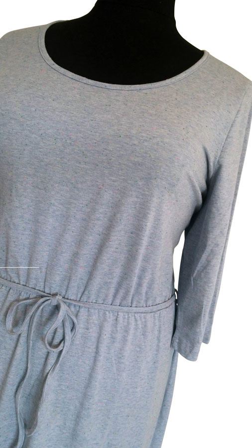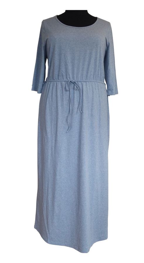 Enkel basis maxi-kjole med ¾ ærmer og rund hals. Under brystet er der i hver side en bæltestrop til det medfølgende bindebånd. Fra knæet og ned er der en slids i venstre side.