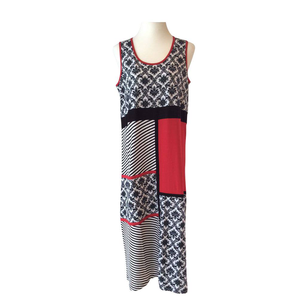 Vidunderlig kjole fra Handberg, der er sammensat af forskellige metervarer. Kjolen er i sort, hvid og tomatrød. Kjolen er uden ærmer og rund udskæring. I udskæringen og ved ærmerne er en tynd tomatrød bort.