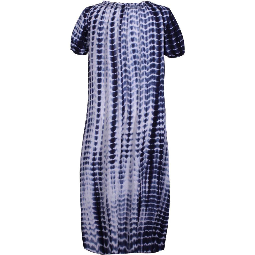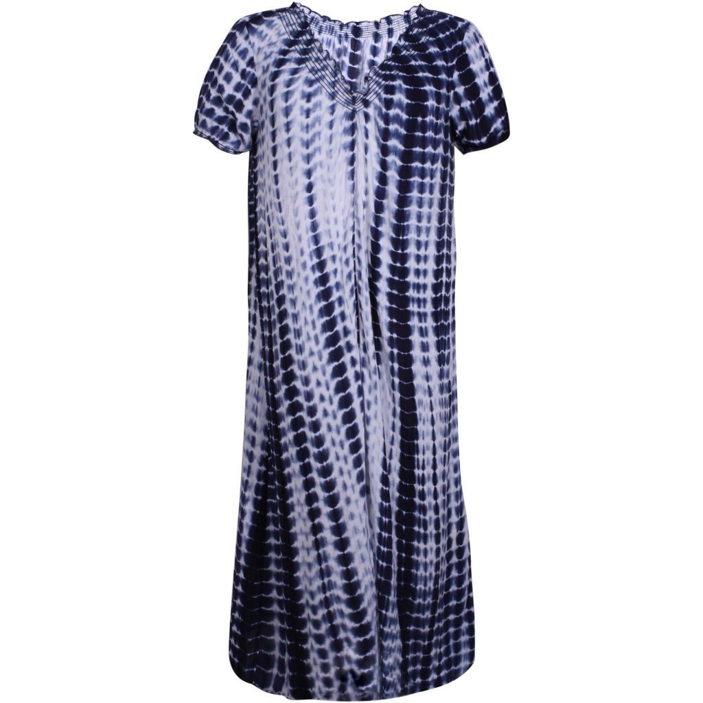 Lækker, lang maxi-kjole i blåt batik look. Kjolen er med en blød v-udskæring med en flæse yderst og smock-elastik under. Ud fra v-udskæringen er der små lag, der gør at kjolen falder flot på kroppen. Kjolen er med korte ærmer, der afsluttes med en smal elastik.