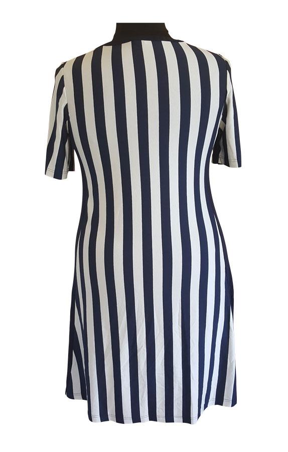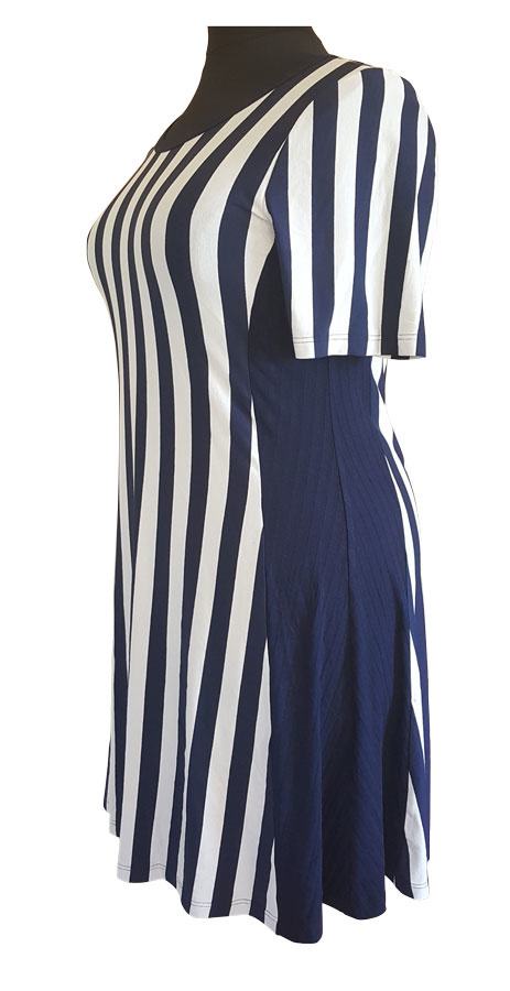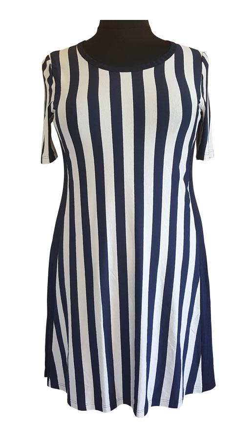 Sød og sommerlig kjole i en flot navyblå. Kjolen er i A-facon. Fronten og bagstykket er i lodrette striber i farverne hvid og navy, og siderne på kjolen er i navyblå.