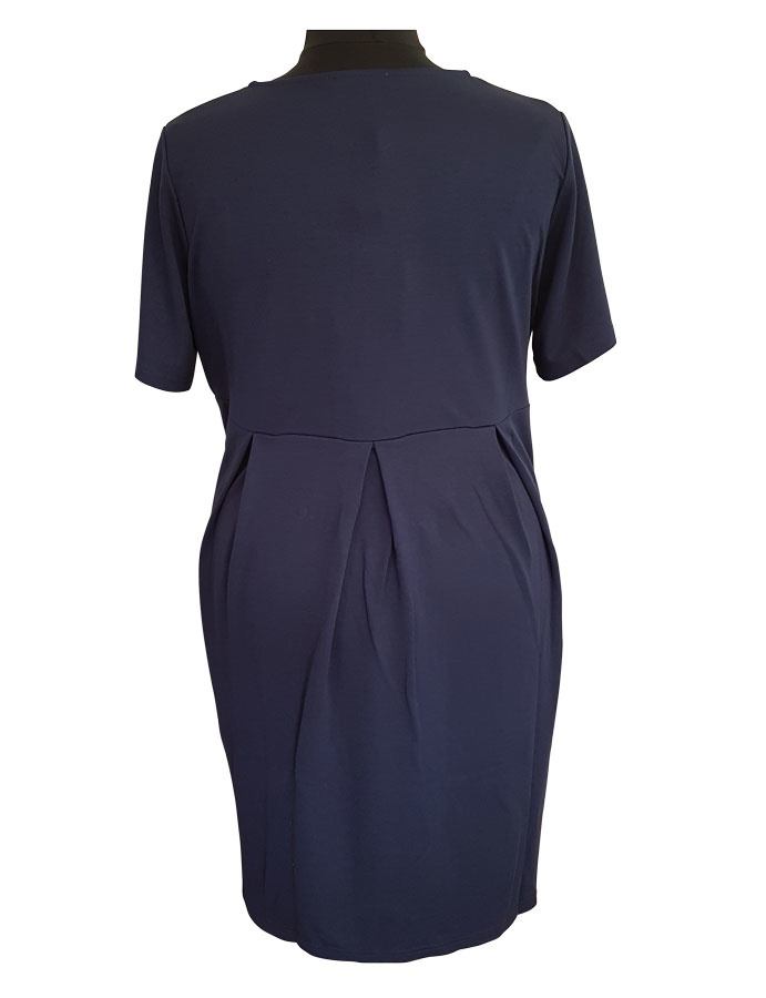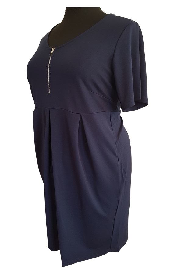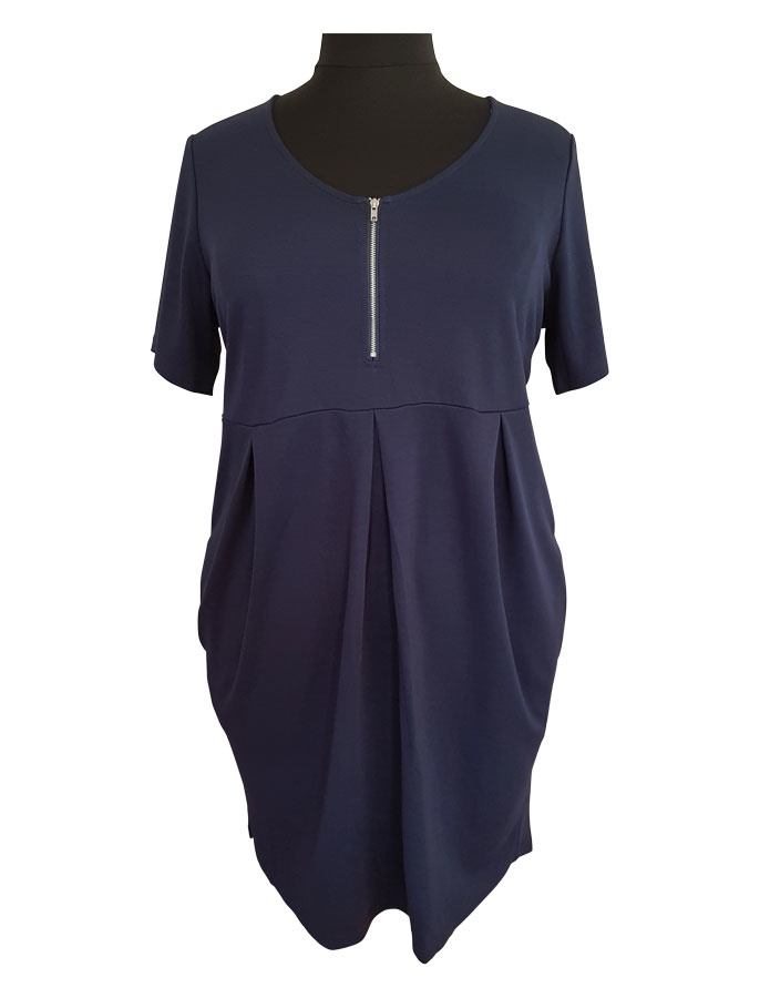 Lækker, loosefit kjole fra Studio i en flot navyblå. Kjolen er med korte ærmer og rund halsudskæring. Midt på udskæringen er der en lynlås, som enten kan lynes op, hvis man vil have en anden udskæring ellers fungerer den som en detalje. Kjolen, der er i en let A-facon, er skåret under brystet, så den hjælper med at skjule topmaven. Under skæringen er der lavet læg i kjolen, som sikrer, at kjolen falder flot på en kurvet krop. Kjolen har to skjulte lommer en i hver side.