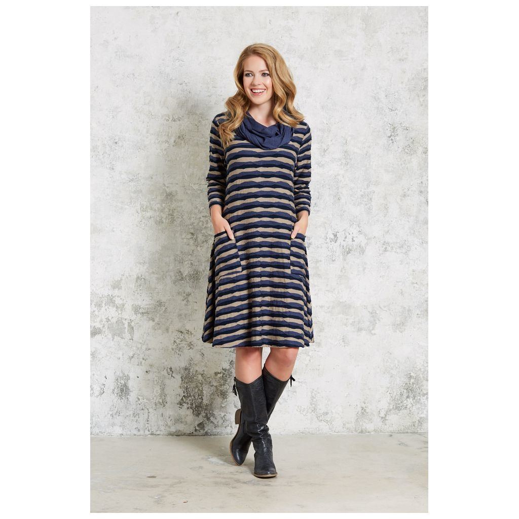 Kjolen fra Pont Neuf er med 3/4 lange ærmer og i et flot 3 farvet stribet mønster, Modellen er flot tætsidende over brystet samtidig med at du får masser af vidde fra taljen og ned, med en bundvidde på 107 cm i str M (40-42) falder den super flot og giver masser af liv. Kjolen har en længde på 103 cm bag i str M.