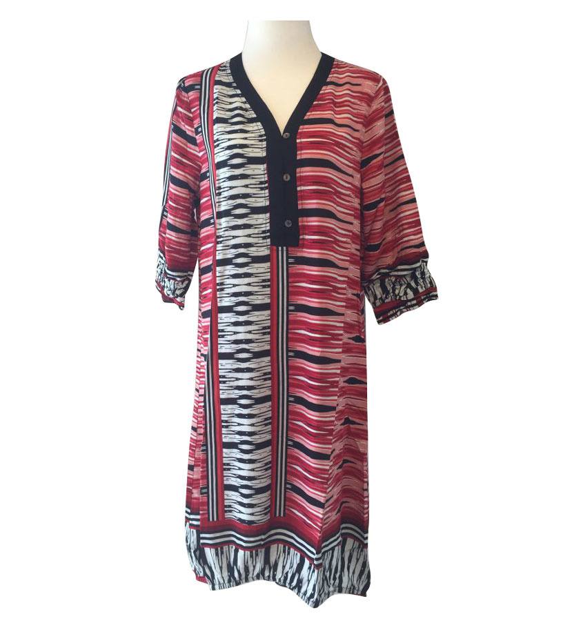 Flot kjole i en super lækker viskose med et grafisk print i rød, sort og hvid farve. Kjolen er med v-halsudskæring, der omgives af en sort bort. Stolperne fra halsudskæringen fortsætter ned over barmen med fire knapper, så du kan selv bestemme, hvor meget udskæring du ønsker. Kjolen er med lange ærmer, der afsluttes med løse lodrette elastikker, der giver en flot detalje. Denne detalje er på de sidste 5-10 cm – alt efter hvor meget man strækker elastikken.