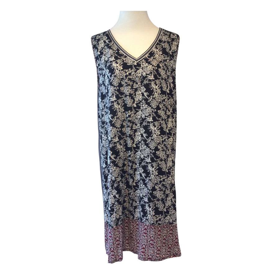 Sød kjole uden ærmer og med v-udskæring i nogle lækre stoffer. I v-udskæringen er der er lille ribkant. I ærmegabet er der en tynd bort med det samme røde stof, som der er en bred bort af nederst på kjolen både foran og bagpå. Bagpå er kjolen ensfarvet grå, dog med den brede bort forneden.
