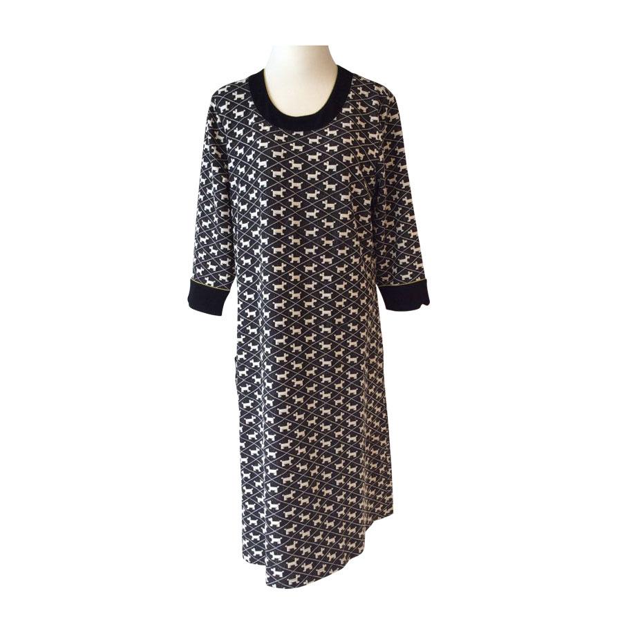 Pæn, sort knælang kjole med detaljer i lime. Kjolen er med en sort grundfarve med et hvidt grafisk mønster bestående små hunde. I højre side har kjolen en sort lomme med en tynd bort i lime. Denne flotte kjole er med ¾ ærmer, der nederst har en tynd lime bort og en bred sort bort, lige som den runde halsudskæring. Ærmerne har en bred lime bort på bagsiden, så hviis man vil have lidt ekstra spræl, kan man vælge at folde ærmerne op.