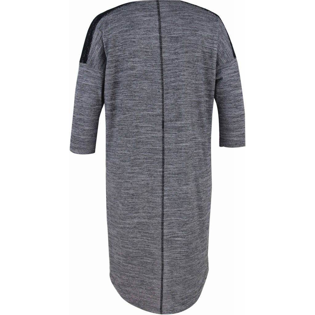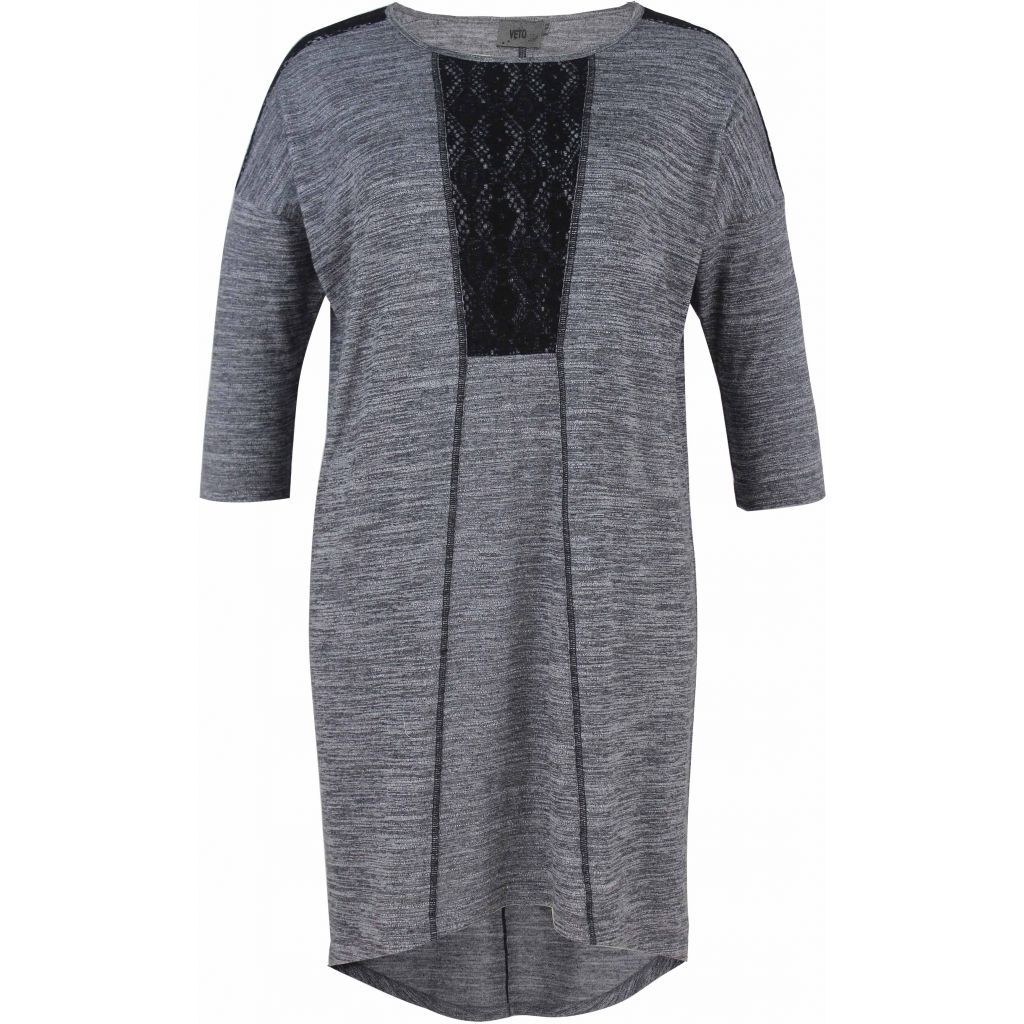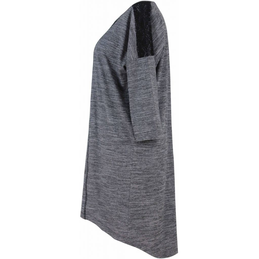 Smart feminin kjole med søde blonde detaljer. Kjolen er med rund hals og er i meleret stof. Kjolen har mange søde detaljer, der er fx indsat blonde over begge skuldre samt et stykke blonde på forstykket. Derudover har kjolen flere steder sorte syninger, som virker slankende og illustrerer kroppens kurver.