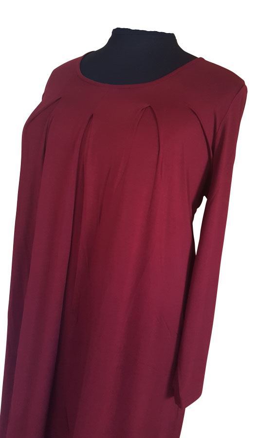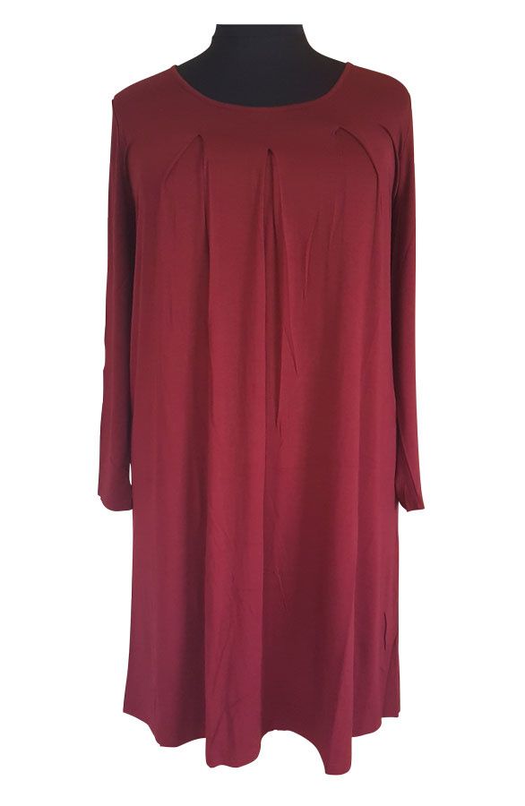 Pæn kjole der falder super flot på en kurvet krop. Kjolen er i en flot vinrød farve og den er med lange ærmer. Kjolen er med rund halsudskæring. Henover brystet har kjolen tre fine læg, som gør, at kjolen fremhæver kroppen på bedst mulig vis.