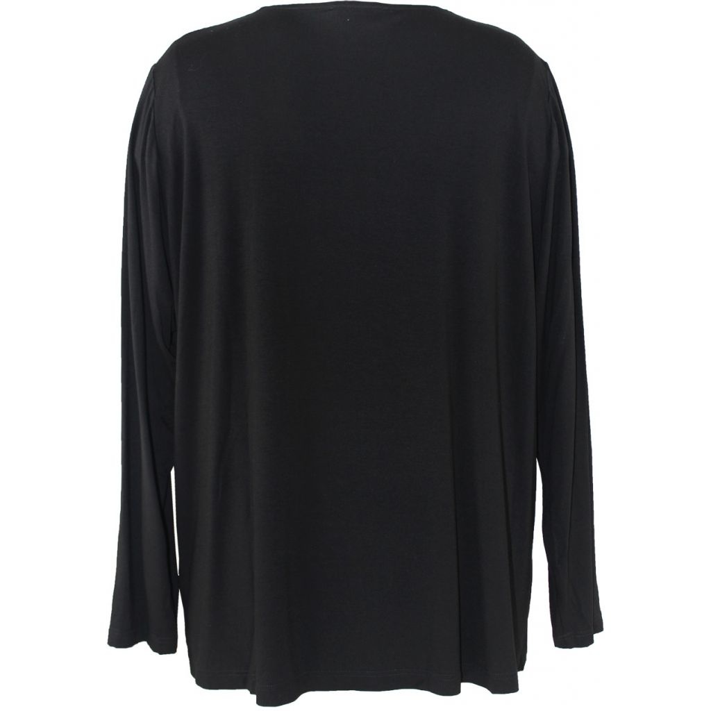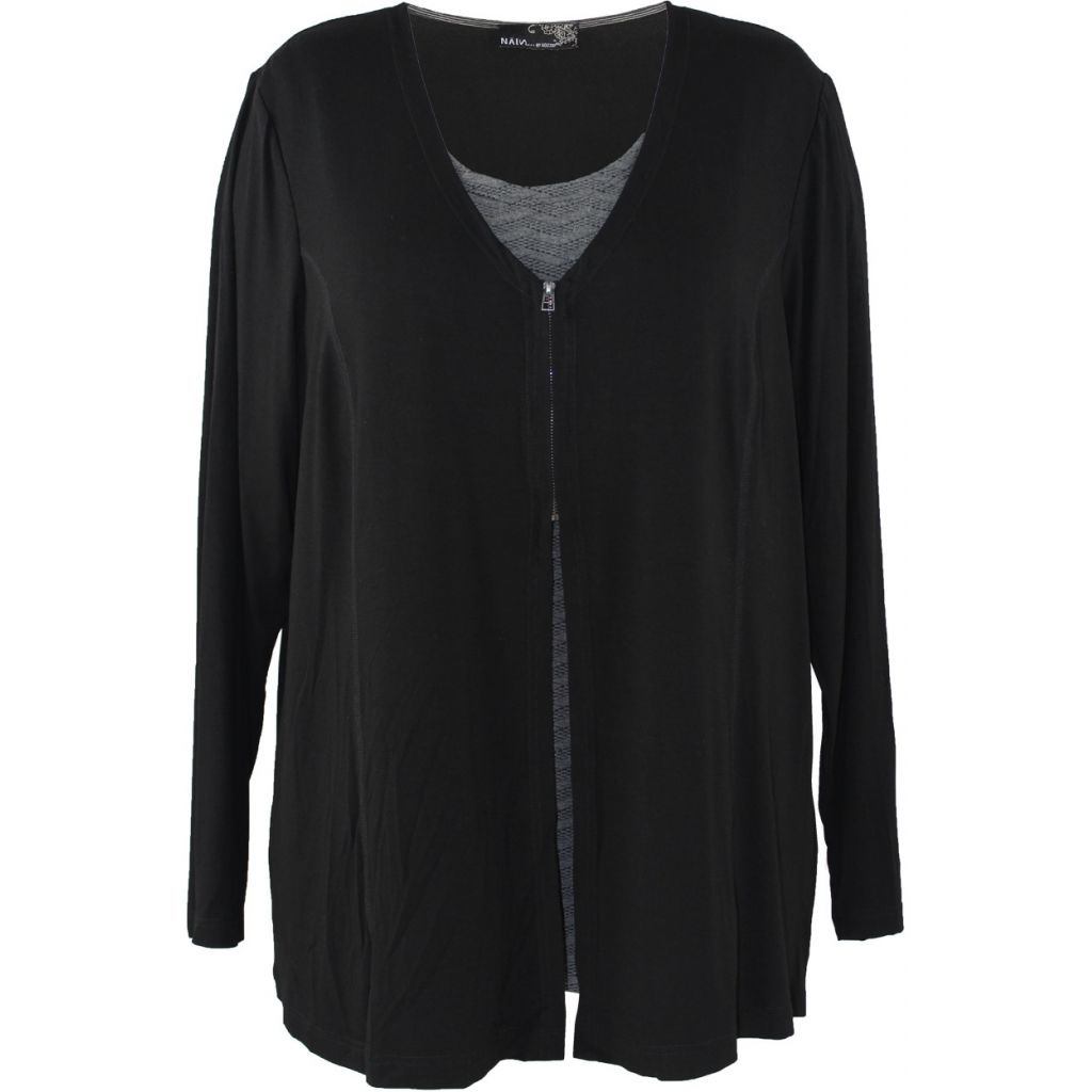 Smart sort T-shirt med cardigan-effekt. T-shirtens ryg og lange ærmer er sorte. Fronten er lavet i to lag, det inderste lag er i en flot grå metervare, og uden på er et sort lag, der er åbent i bunden og lukket hen over brystet med en lynlås. Virkelig lækker T-shirt, der kan skjule lidt af maven.