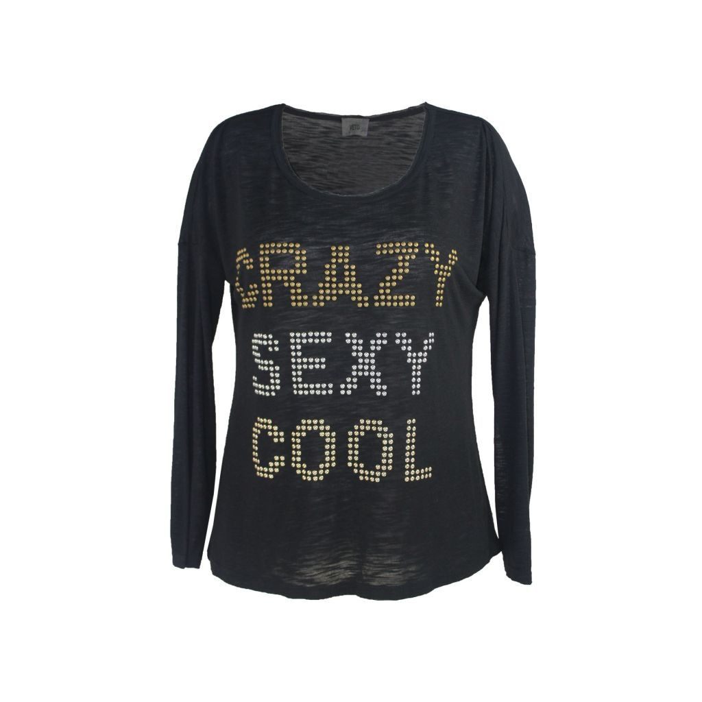 Flot langærmet T-shirt med nitter. På fronten står der CRAZY med kobbernitter, SEXY med sølvnitter og COOL med nitter i guld. T-shirten har åbne kanter, som sammen med nitterne giver den et lidt råt look.