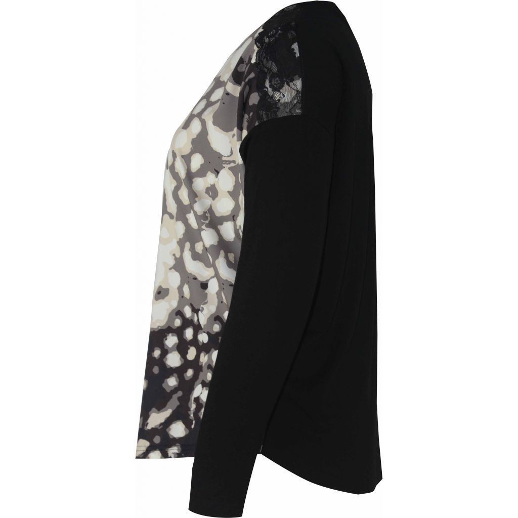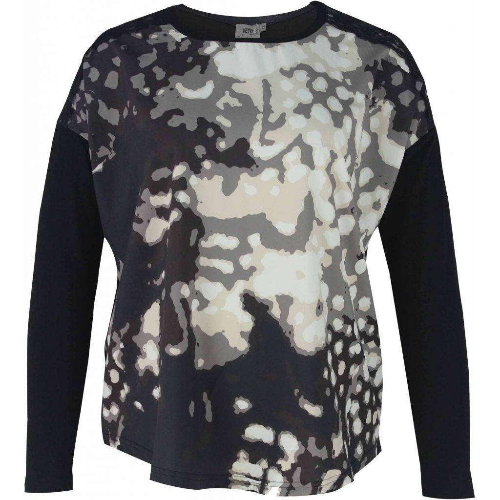 På fronten har T-shirten er grafisk print i hvide, brune og grålige farver. På ærmerne og bagpå er T-shirten sort.