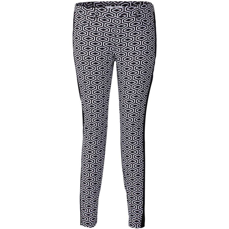 Lange leggins i et grafisk sort og hvidt print. På ydersiden er der en bred sort stolpe, der giver disse leggins er fedt udtryk. I taljen er der bæltestropper, derudover er der for og baglommer. I taljen er der en bred indsyet elastik, så komforten er i top, samtidig med at du får et look som med et par smarte bukser.