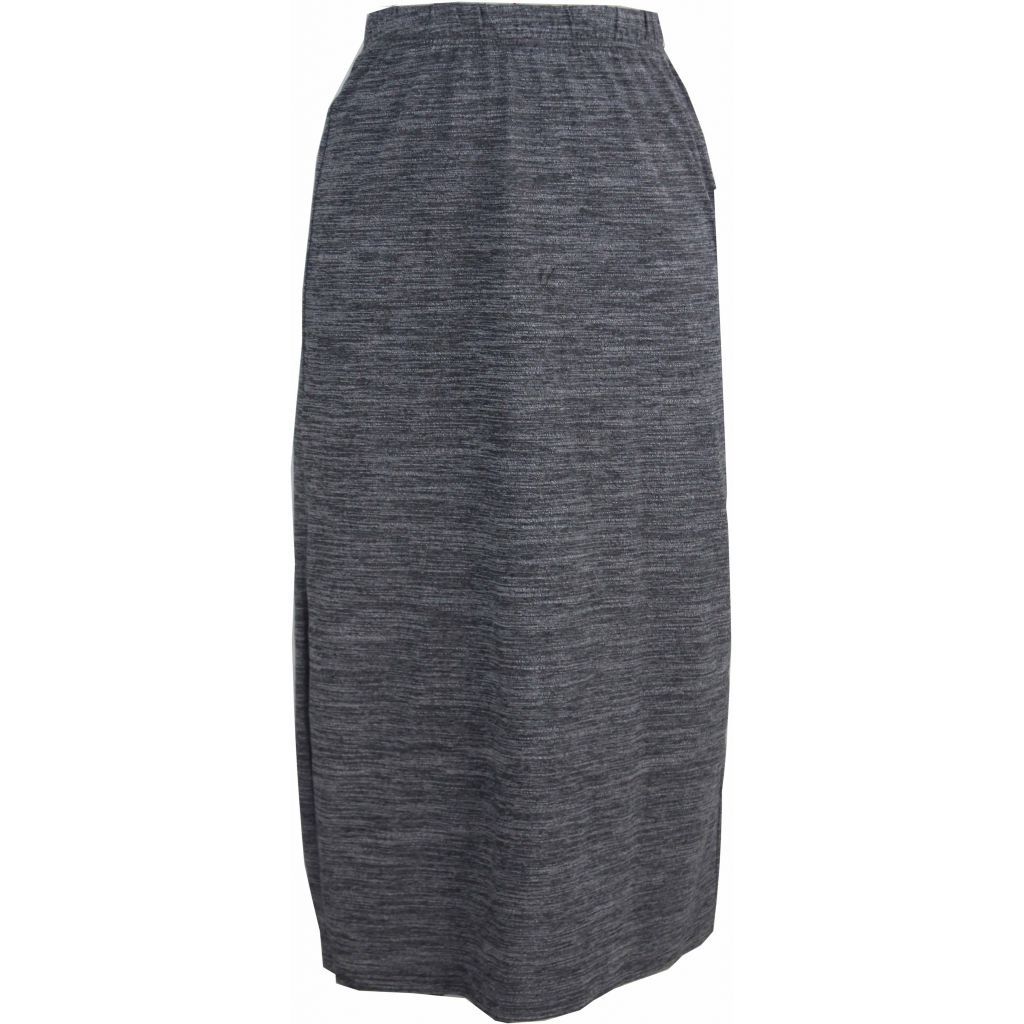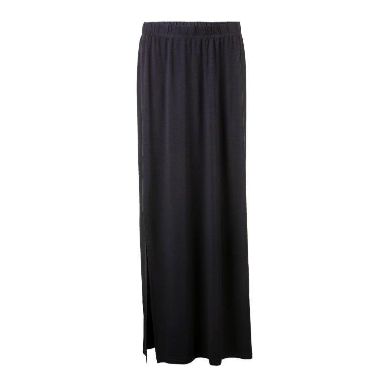 Pæn sort lang basis nederdel i en god viskose metervare. Nederdelen er med bred indsyet elastik i taljen. Ca. fra knæet og ned har nederdelen en lang slids i højre side.