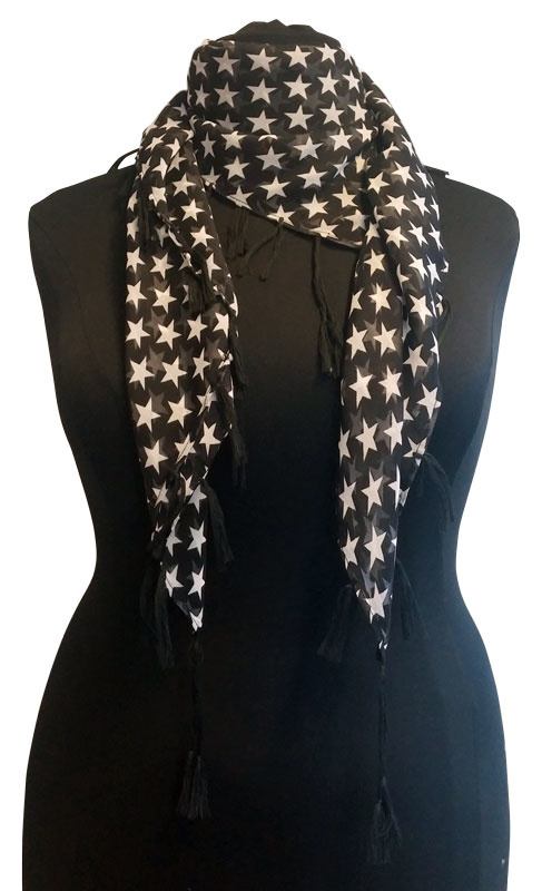 Tørklædet er sort m. hvid stjernet mønster.