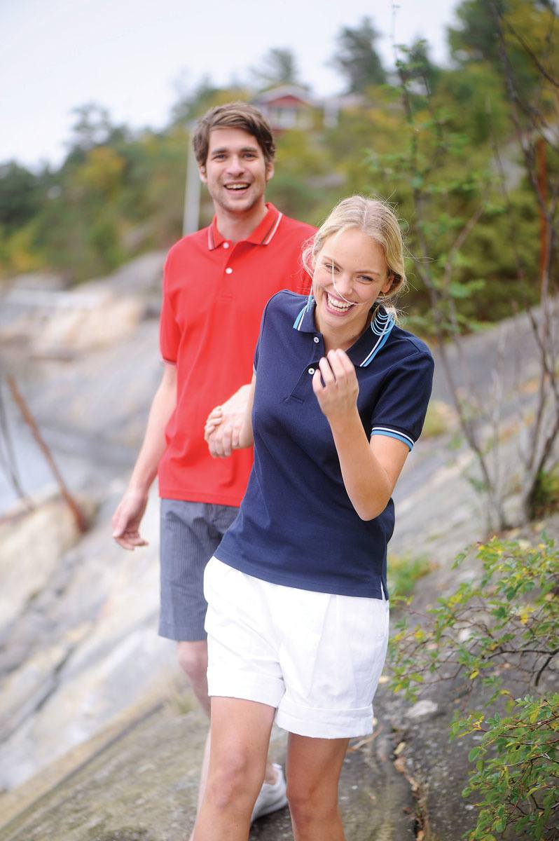 En lækker pige pique polo-shirt som giver dig følelsen af "luksus". En lækker polo-shirt i flere farver hvor polo-shirten er med kontrastfarver på krave og ærmer. Polo-shirten har to knapper i halsen.