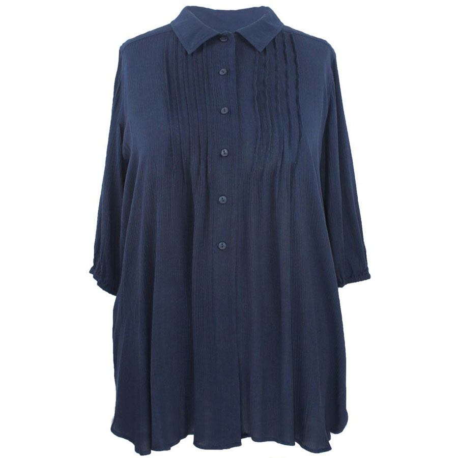 Smart, lang og let skjorte med gode detaljer. Den langærmede skjorte er i lettere crepet stof, og skjorten er med draperinger hen over brystet. De lange ærmer afsluttes med en tynd løs elastik. Der er syv knapper ned i en stolpelukning på fronten.