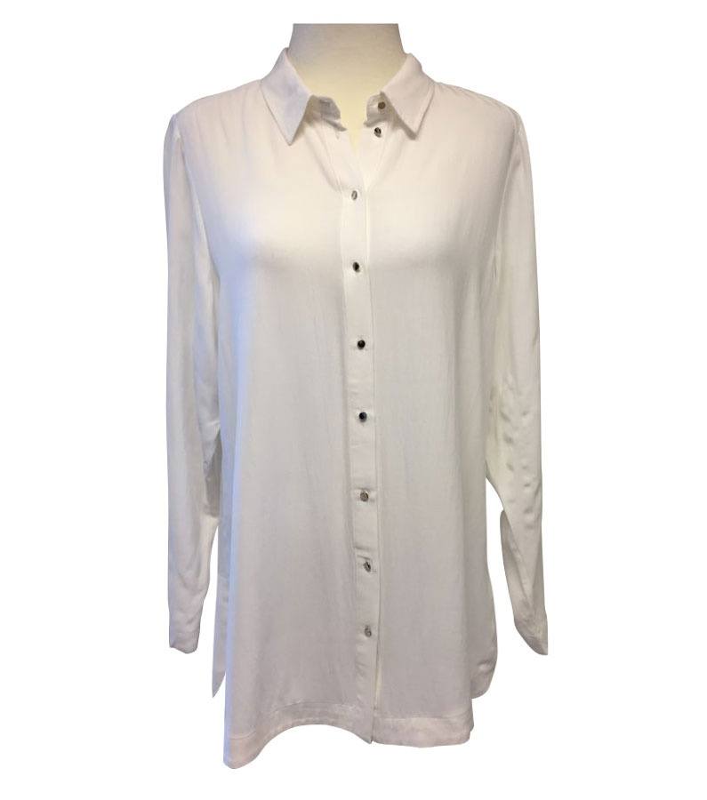 Flot klassisk hvid skjorte i 100% viskose. Dette betyder, at skjorten er meget let og behagelig at have på. Skjorten er med klassisk hals og lange ærmer. Foran lukkes skjorten med 8 metallic knapper. Dette giver den klassiske skjorte et lidt anderledes look.