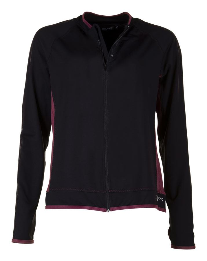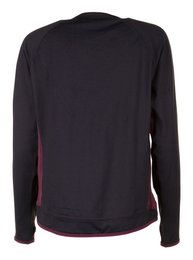 Sportsjakken er i sort med aubergine farvede paneler i siderne. Panelerne virker slankende