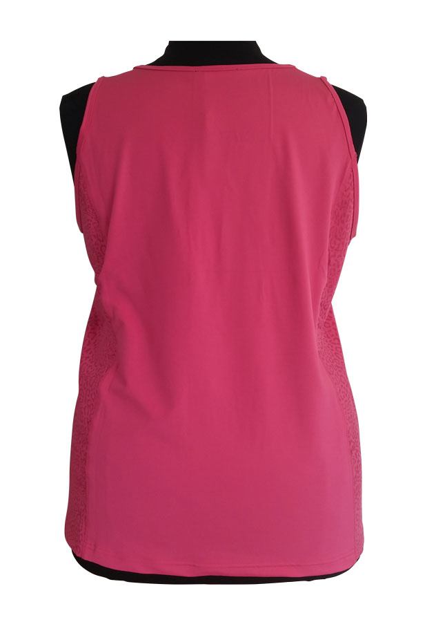 Toppen er i pink. I begge sider er der en bred stolpe med leopard print i samme farve som resten af toppen. Front og ryg er i ens farvet. Tank toppen er med synlige syninger, som giver toppen et sporty look.