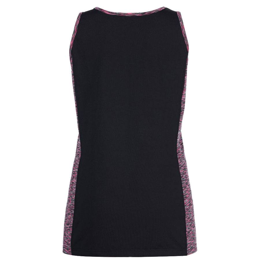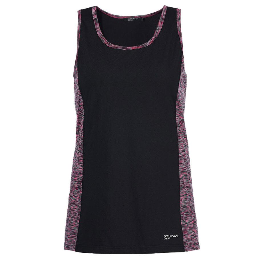 Smart fitness top fra Studio Gym. Toppen er med god vidde. Toppen er sort med pyntebånd i lilla og pink print både rundt i ærmegabet og i den runde halsudskæring. Den samme print er indsat som bredde stolper i siderne. Dette virker slankende. Toppen er lavet I et stof, der holder dig tør ved at trække fugt væk fra huden, samtidig med at der er multi-way stretch, der giver dig større komfort og bevægelsesfrihed.