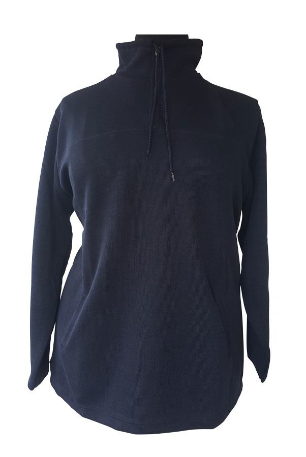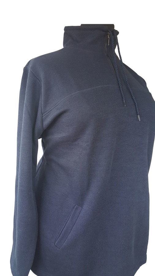 Flot klassisk navyblå sweatshirt med høj hals, rundt i halsen er et bindebånd, hvis du ønsker trøjen skal lukkes helt ved halsen. Sweatshirten er med lynlås i halsudskæringen og lange ærmer. Henover barmen er lavet en syning, som gør at sweatshirten falder pænere på en kurvet krop. Sweatshirten har to skrå lommer foran.