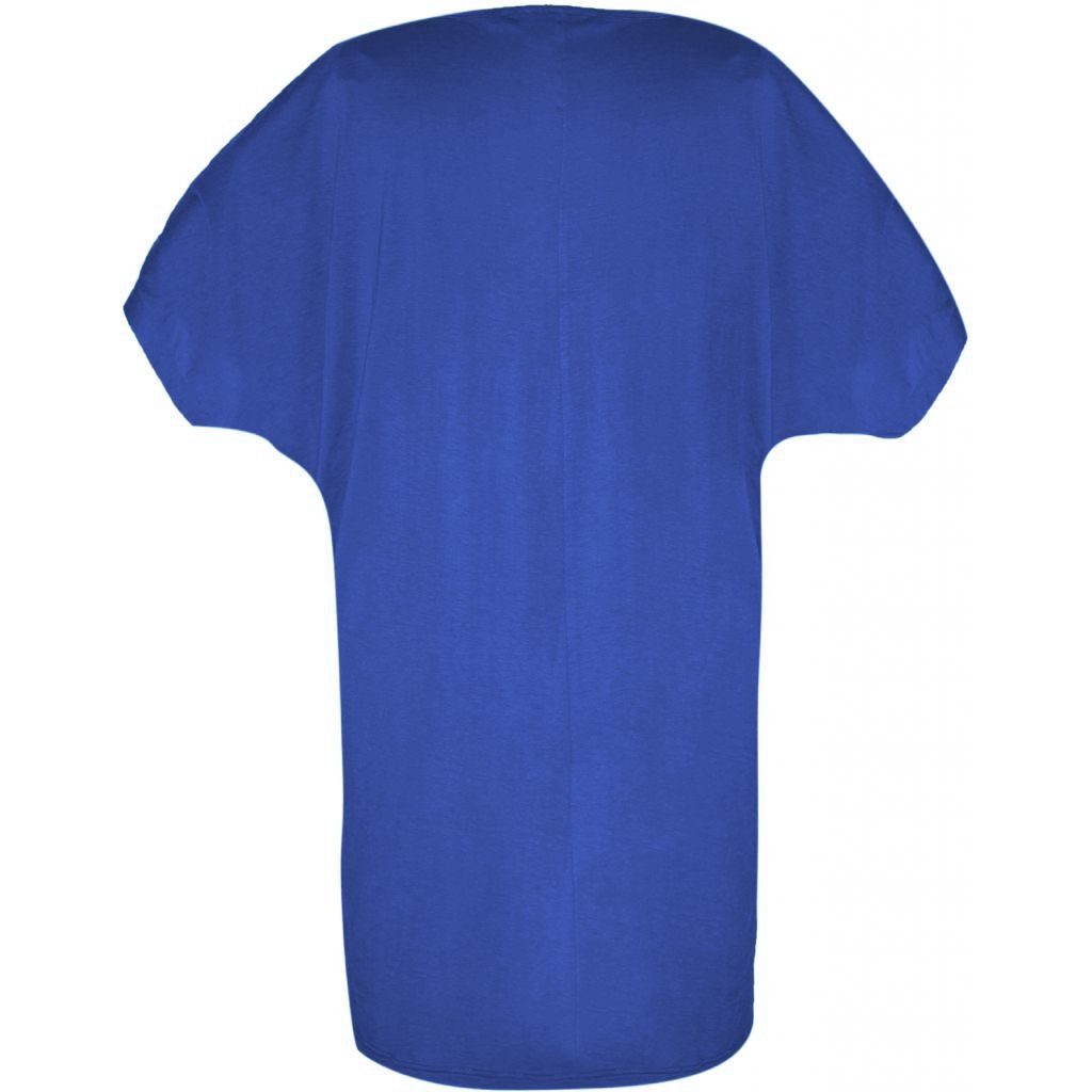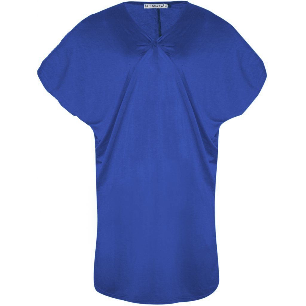 Flot oversize blå tunika med korte flagermusærmer og en smart v-udskæring. Midt på halsudskæringen er der lavet tre læg, der sikrer, at tunikaen falder flot på en kurvet krop og samtidig skjuler topmaven.