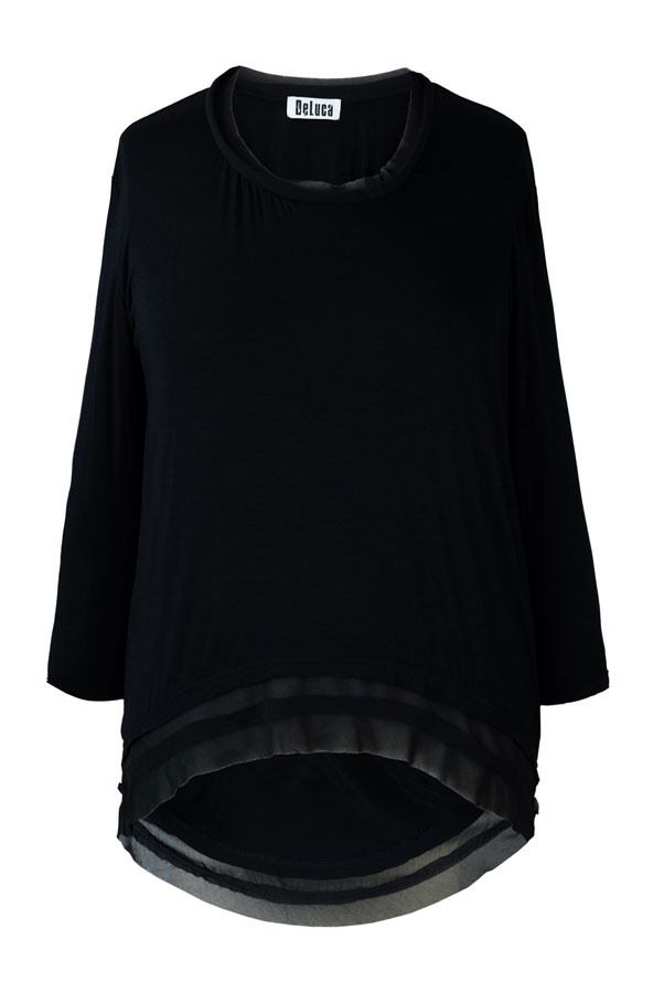 Super blød og let, sort DeLuca T-shirt med 3/4 lange ærmer. T-shirten er lang bagtil, så den går lidt ned over numsen. T-shirten er med delvis rå tyl-kanter forneden, i ærmeåbningerne og i halsen.