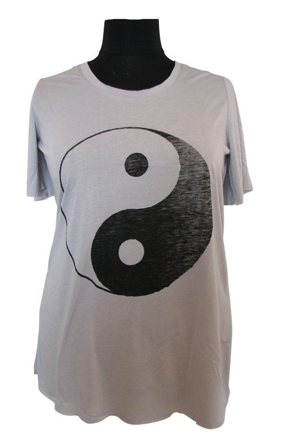 På brystet er der et print af yin og yang, på den sorte t-shirt er printet gråt, og på den grå t-shirt er printet sort.