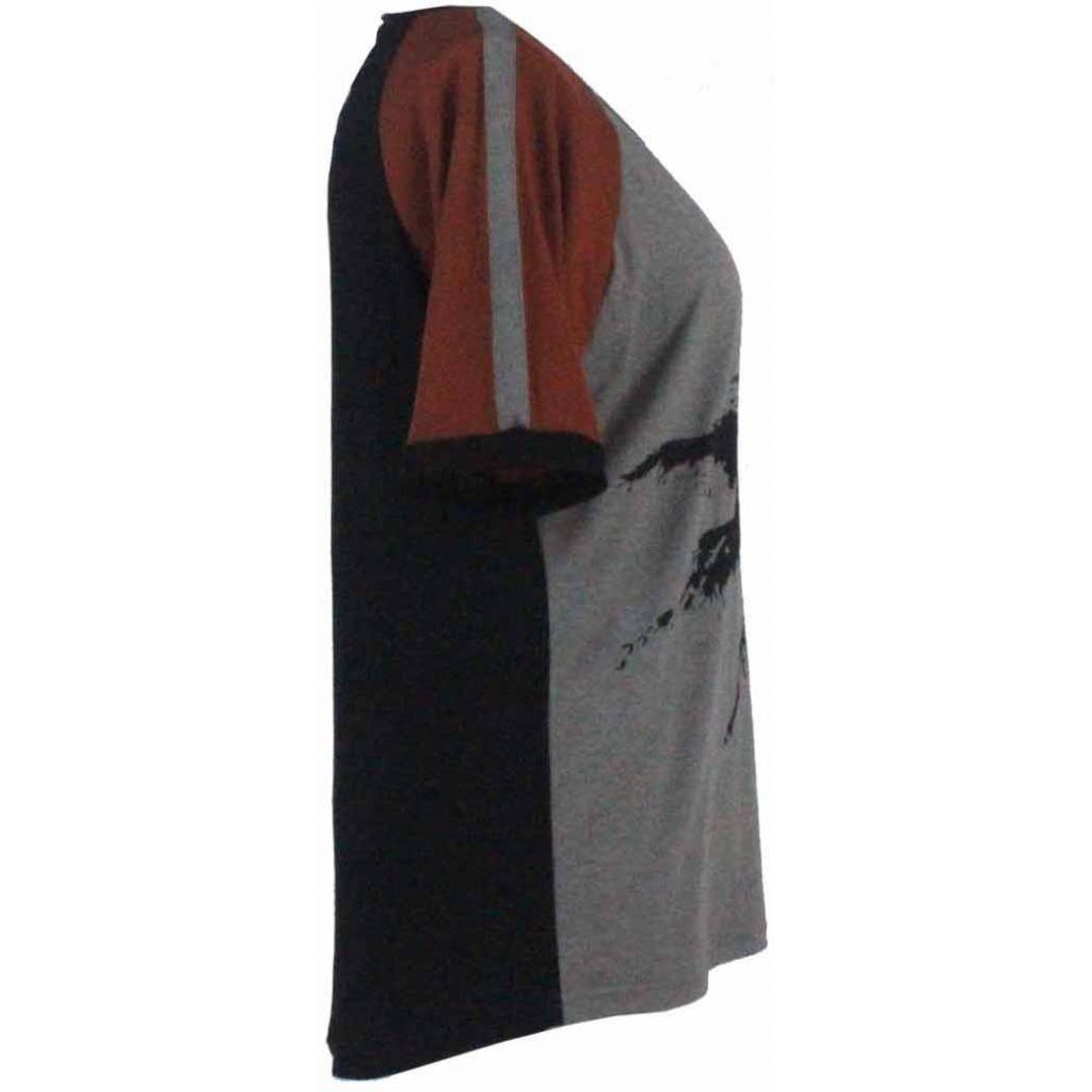 Flot T-shirt med rund hals og korte terracotta farvede ærmer, øverst på ærmet er der er ca. 2 cm bred grå melange stribe og ærmerne afsluttes med en sort bort.
