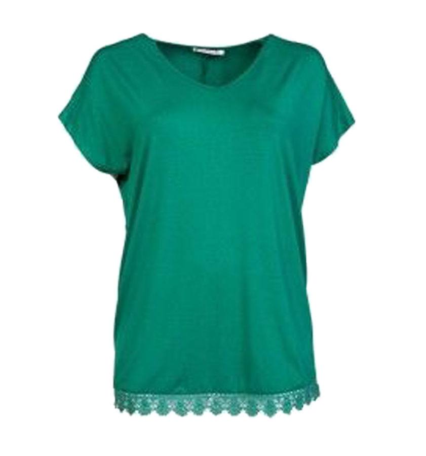 Pæn grøn T-shirt fra Studio med lille v-hals, der er kendt for deres blondedetaljer. T-shirten er lavet i en meget blød metervare, så den er behagelig at have på.