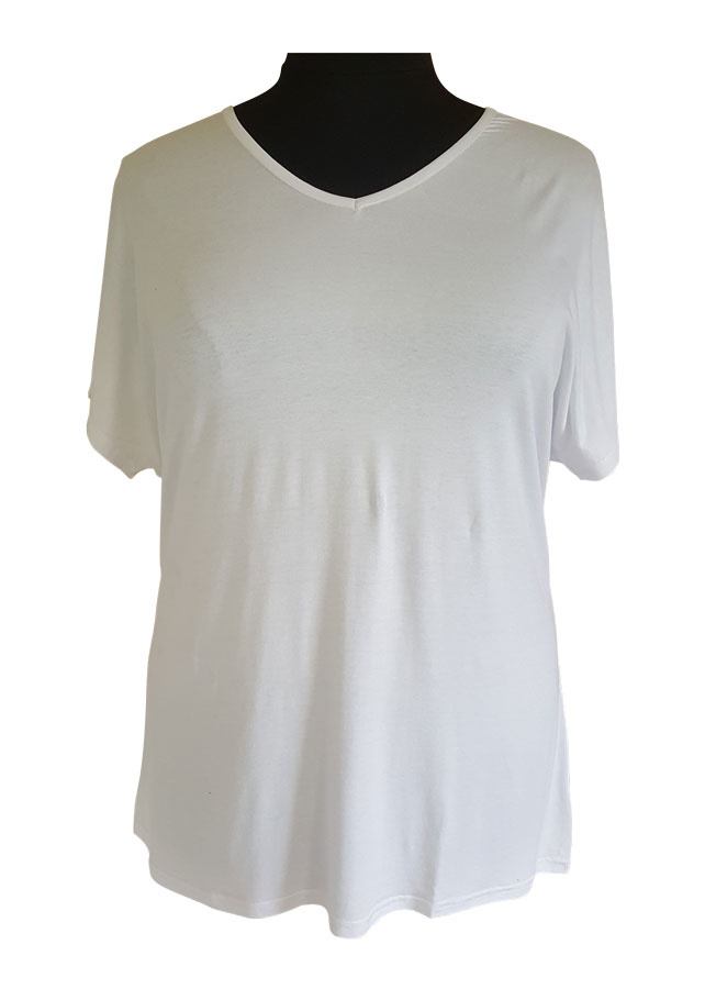 Let hvid basis t-shirt med korte ærmer i en blød viskose kvalitet. Blusen er lavet med v-udskæring.