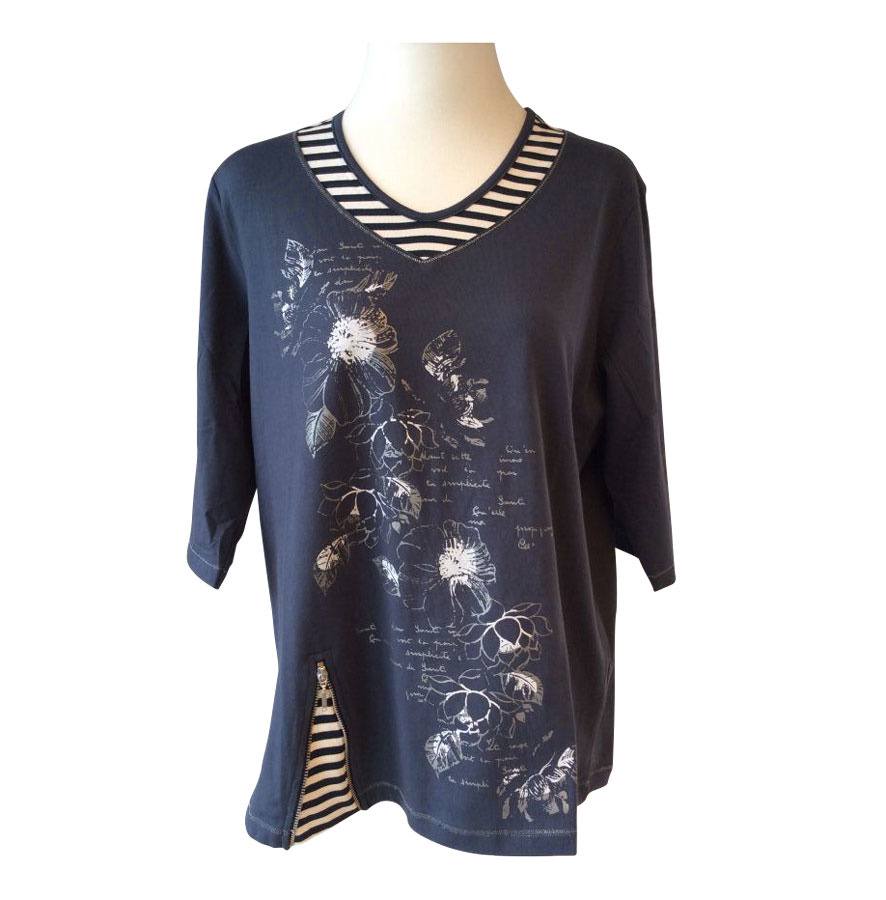 Sød T-shirt i navyblå med søde maritime detaljer i v-udskæringen og nederst på fronten, hvor der er indsat en lynlås – lader man lynlåsen stå åben, er der en lille slids med samme stribede maritime stof. T-shirten er med ¾ lange ærmer. Alle synlige syninger er lavet med ”sølvtråd.” På fronten er der et blomstret print i hvidt og mat sølv.
