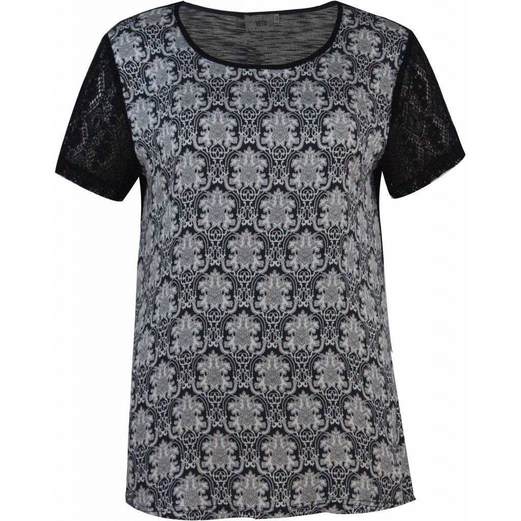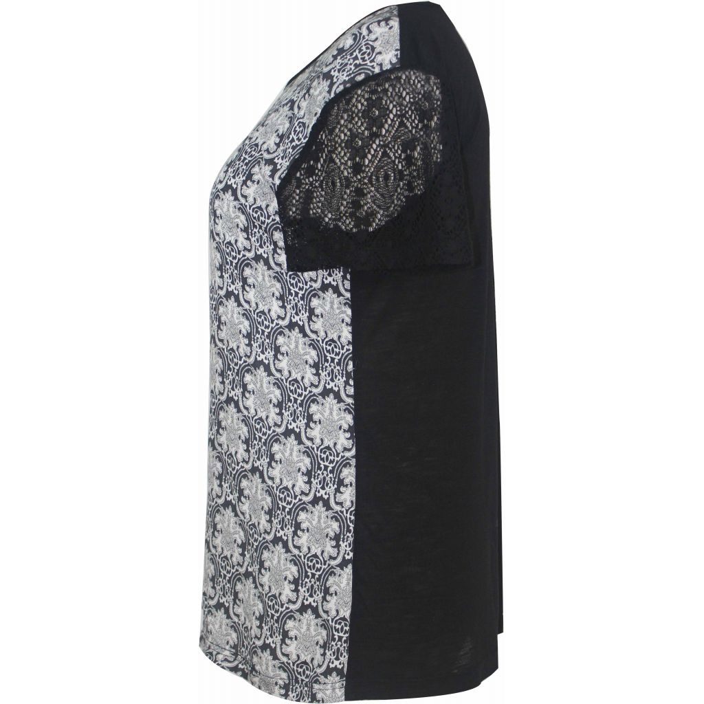 Smart T-shirt med flot print på fronten og rund hals. De korte ærmer er lavet i en sød blonde, der giver blusen et flot og eksklusivt udtryk. Bagpå er blusen sort – stoffet er lettere gennemsigtigt. Både forstykket og ryggen runder en smule i bunden.