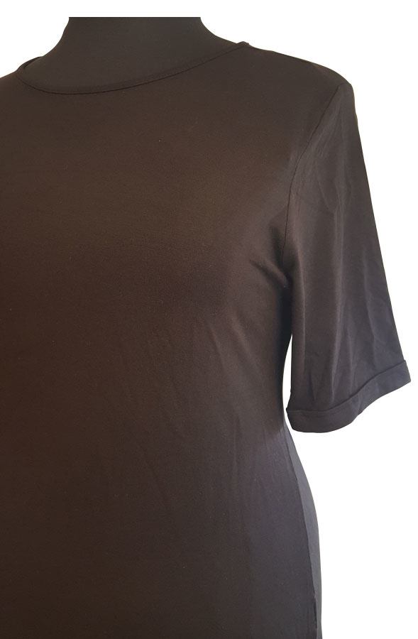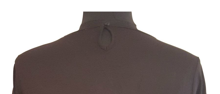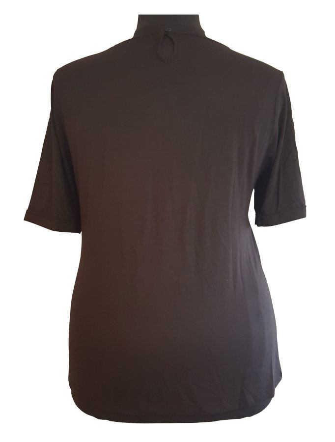 Pæn starlet T-shirt med korte ærmer og rund halsudskæring. Bagpå er der øverst en lille keyhole åbning, der kan lukkes med en knap. Du kan også vælge at lade knappen stå åben og få en lidt mere nedringet t-shirt.