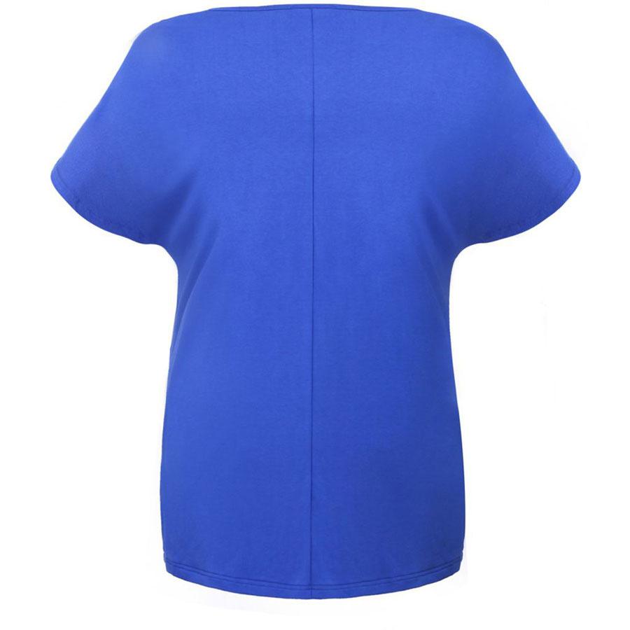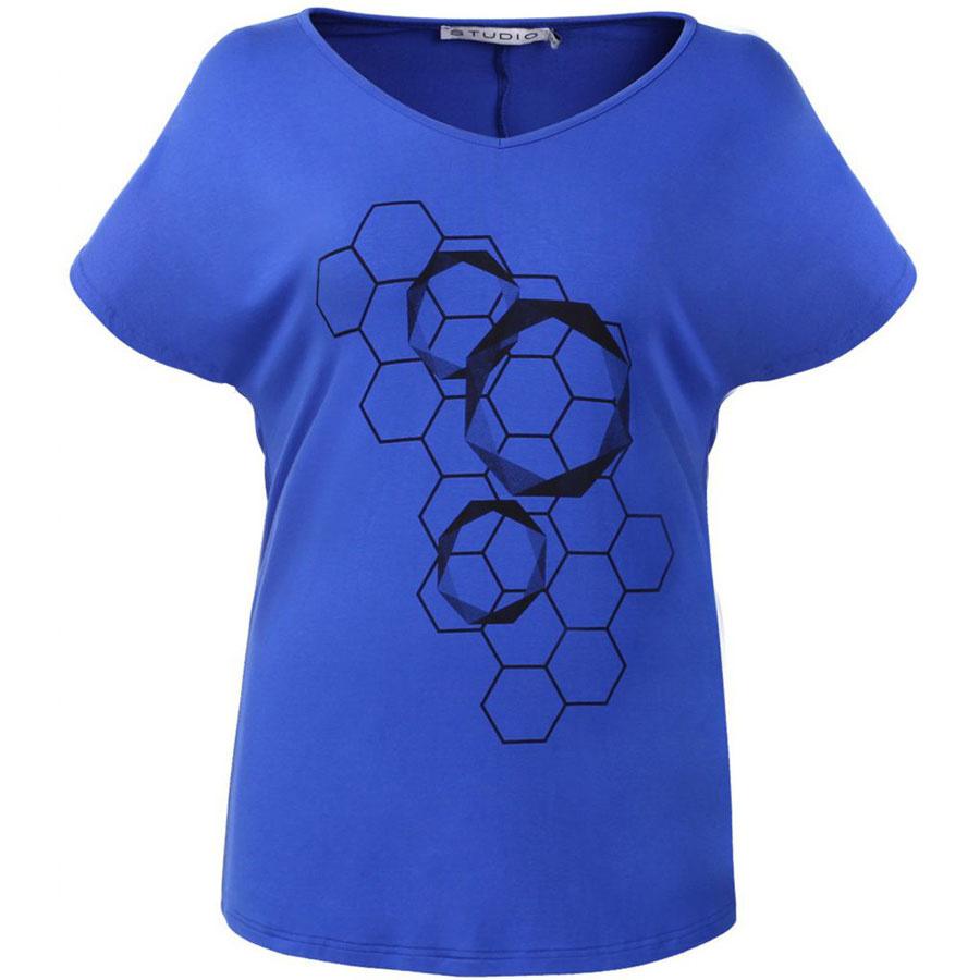 Flot koboltblå T-shirt med korte flagermusærmer. På fronten har T-shirten er sort print af sekskanter i forskellige størrelse. T-shirten er med v-hals.