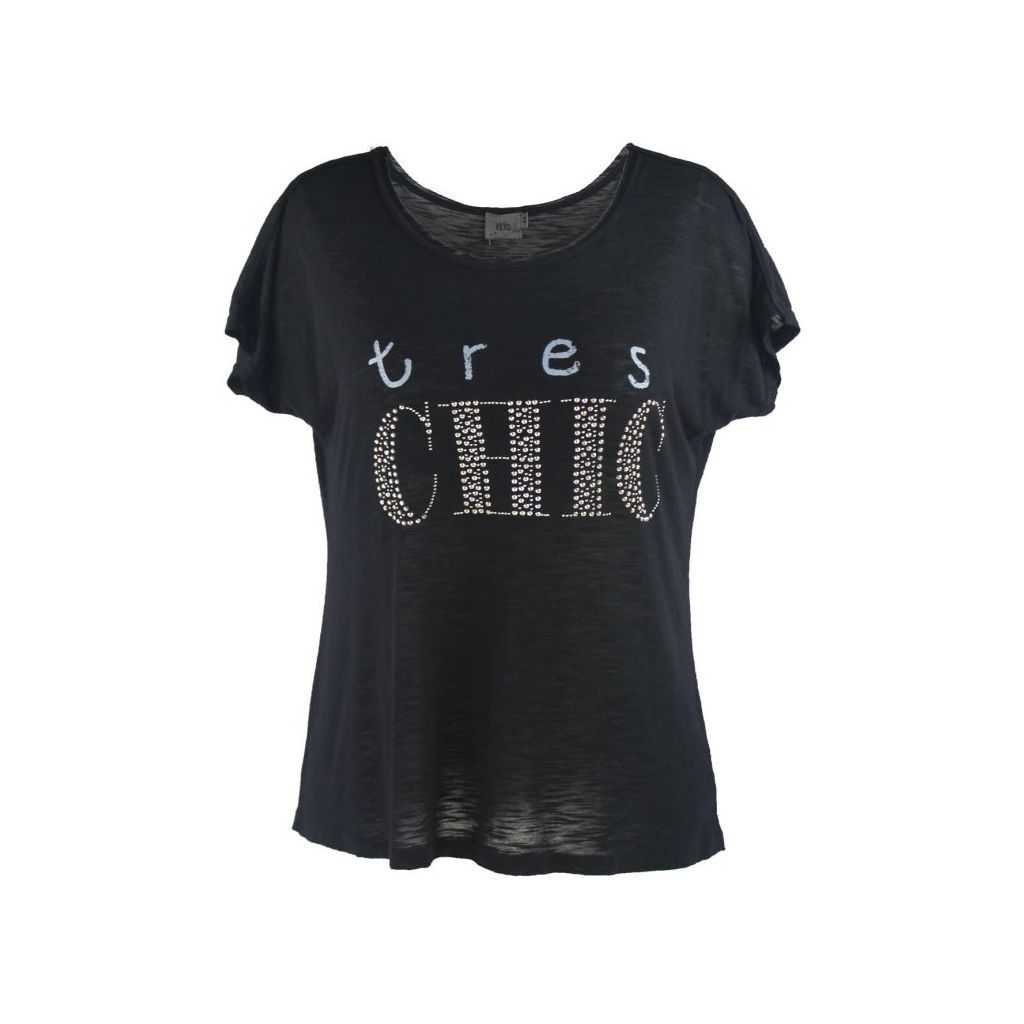 Tres Chic sort, kortærmet T-shirt med tekst og nitter hen over brystet. Med print står der "tres" og med nitter i forskellige størrelser står der "CHIC". Smart under en jakke eller cardigan, men T-shirten er også flot med en farvet top under, som kan give den lidt ekstra kant, da stoffet er lettere gennemsigtigt.