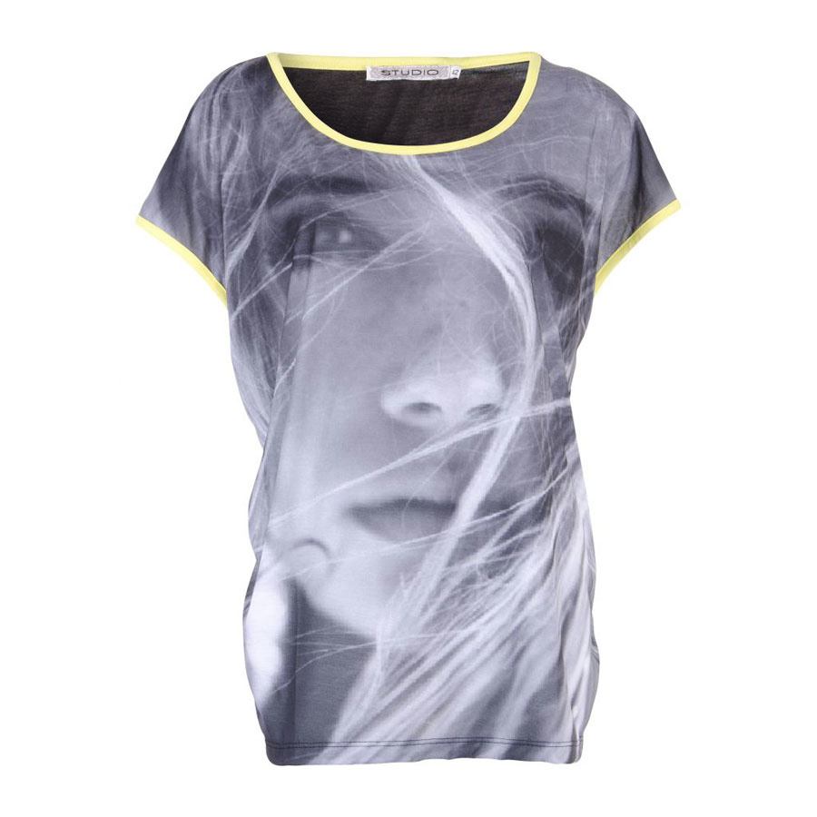 Smart top med print foran af et kvindeansigt helt tæt på. Toppen har rund hals og meget korte ærmer, både hals og ærmer er afsluttet med en frisk kant i gul, der giver en flot kontrast til toppens grå og sorte nuancer. Ryggen på toppen er helt sort.