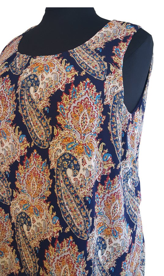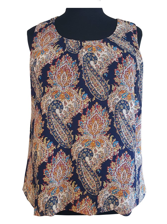 Fin top med ballon effekt. Toppen er lavet i to lag stof, yderst er et tyndt printet stof med et flot mørkeblåt grafisk print. Inden under syet sammen med det yderste lag er et navyblåt lag, som gør, at toppen ikke et gennemsigtig. Samtidig gør måden de to lag stof er syet sammen på, at den falder pænt og er luftig.