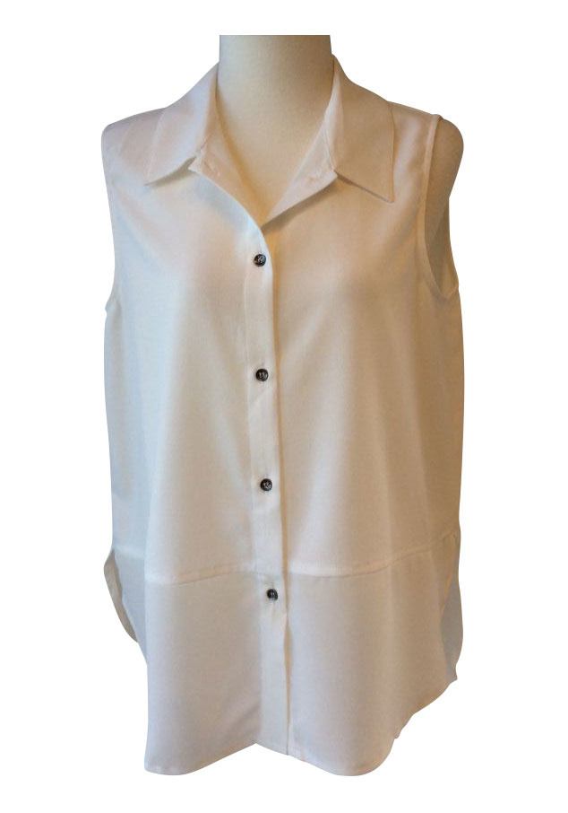 Sød Off White skjorte uden ærmer med sjov detalje. Skjortetoppen har en meget klassisk krave og foran lukkes den med 6 knapper. Fra taljen og ned er der toppen lavet i et andet stof, der er lettere gennemsigtigt, dette giver en klassisk skjorte et sjovt pift.