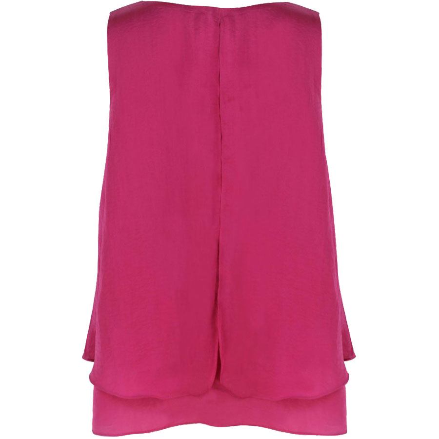 Super smart pink top fra Studio med god slankende effekt. Toppen er uden ærmer og består af en pink underdel, der er syet sammen med to stykker stof, der hænger løst hen over toppen og giver en toppen et løst, friskt og slankende look.