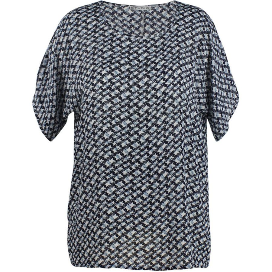 Lækker printet top fra Studio med korte ærmer. Toppen er med rund hals. Printet er i off-white, grå, mørkeblå og lyseblå. Farverne spiller godt sammen og giver toppen et flot look.