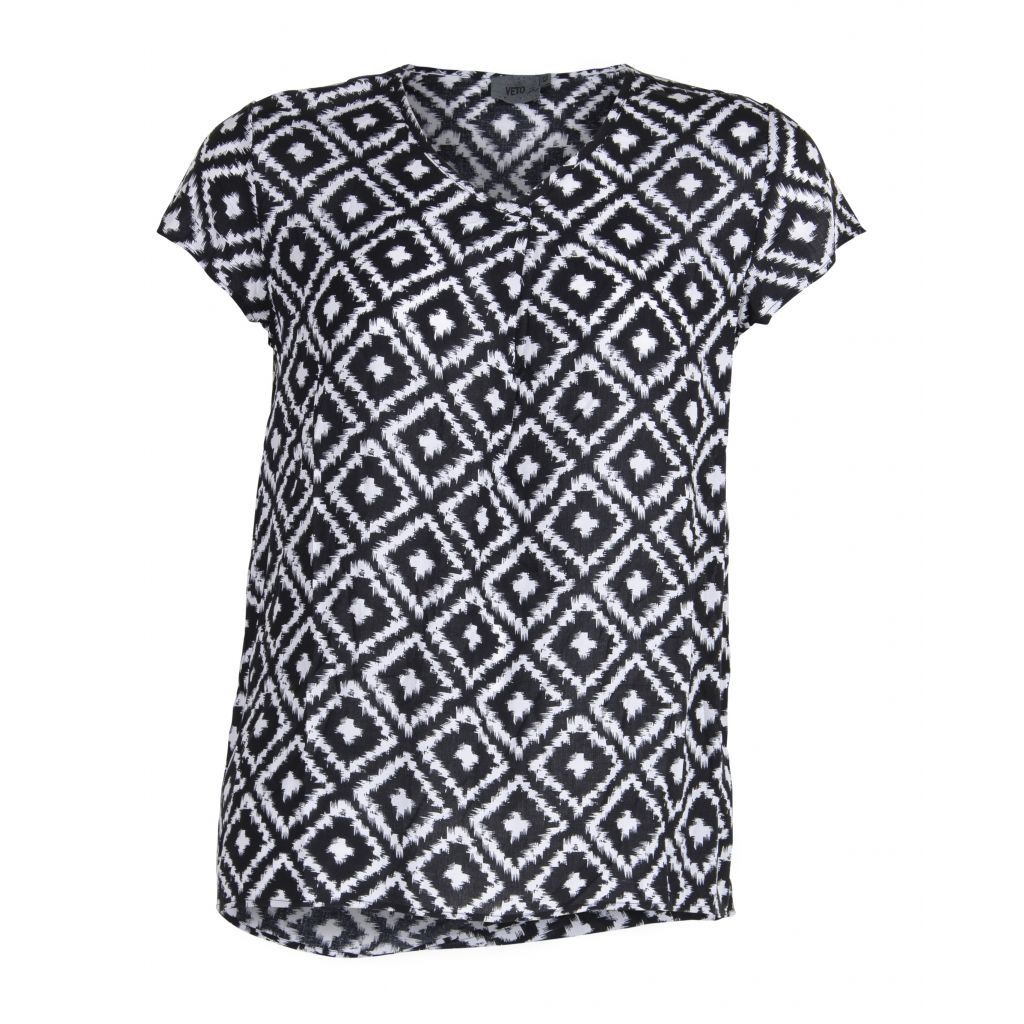 Smart og superlet bluse i 100% rayon fra Veto. Blusen er med korte ærmer og v-hals, v-halsen har en smart detalje midt for, der gør at blusen falder rigtig flot. Blusen er sort med et hvidt mønster, der består af små ruder.