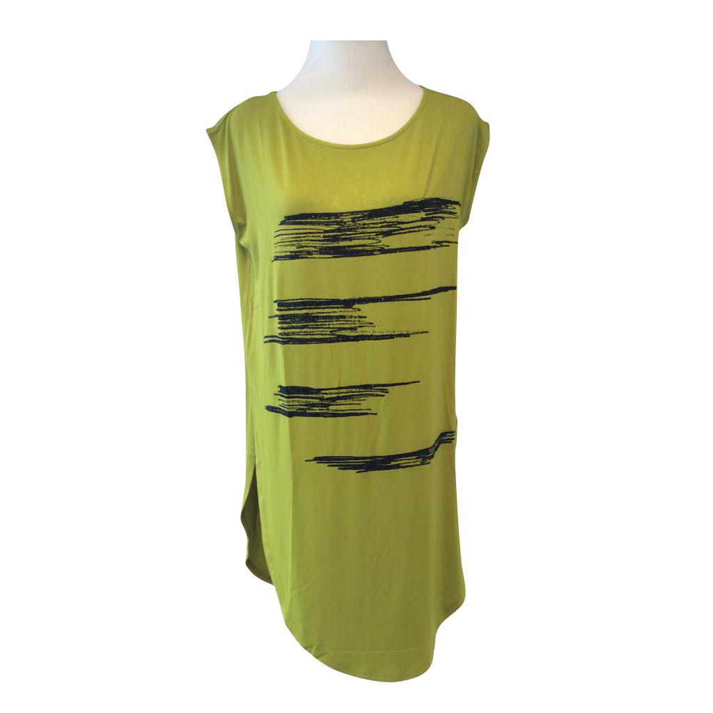 Smart ærmeløs tunika i en lækker lime med grafisk mønster i glimtende sort på fronten. Tunikaen er med rund halsudskæring. Nederst på tunikaen både på forstykket og bagstykket runder tunikaen. Bagstykket er lidt længere end forstykket.