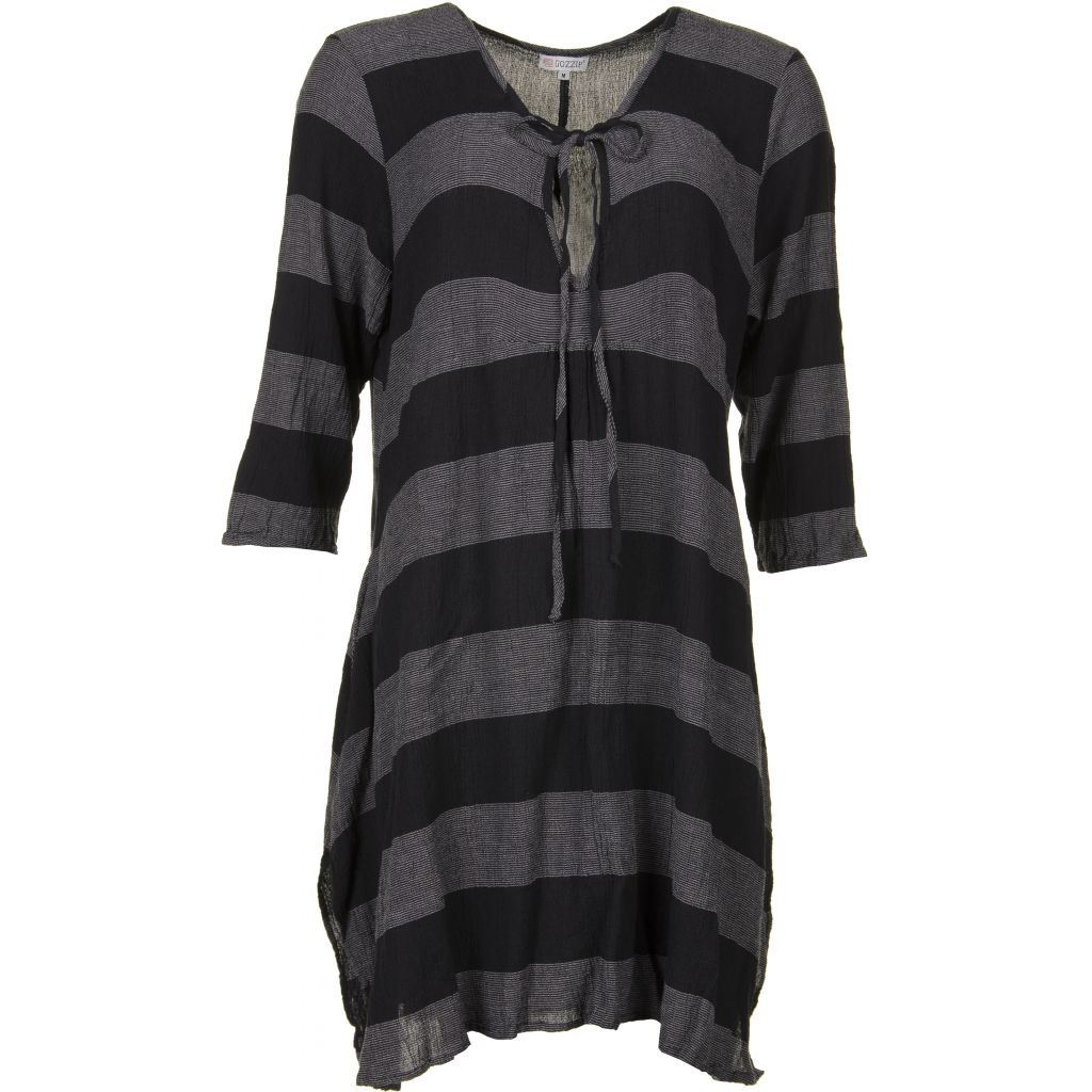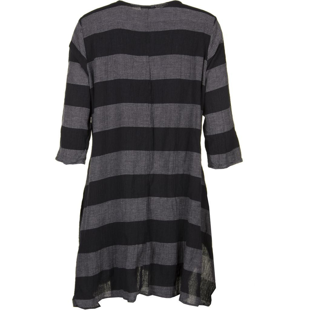 Flot tunika i A-form i en lettere crepet metervare i en god kvalitet. Stoffet er sort og gråt i brede striber. I begge sider er der en indsyet lomme. Tunikaen er med ¾ lange ærmer. Nederst er tunikaen slidset. Dette giver dig større bevægelsesfrihed. Tunikaen er med en lille v-hals. I halsudskæringen er der bindebånd, som du vælge at lade stå åbne eller binde.