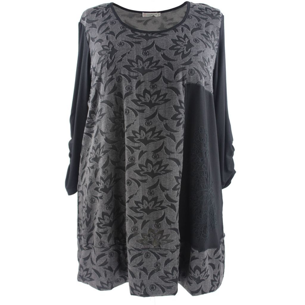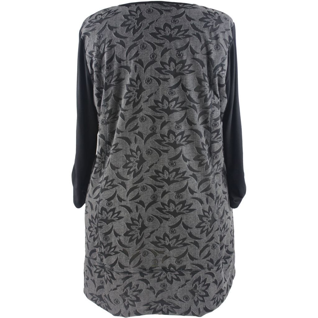 Rigtig flot tunika med mange gode detaljer. Tunikaen er i mønstret stof i grå og sort, på fronten er indsyet et sort stykke stof, hvorpå der er et sort påsyet mønster. Tunikaen har ¾ lange sorte ærmer. Fra albuen og ned er stoffet med rynk.