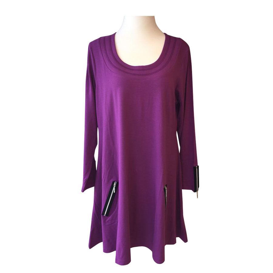 Nederst på ærmerne er der påsyet ”fake” lynlås, ligesom der er to lynlåse foran. Tunikaen er i en flot lilla og styles flot sammen med et par sorte bukser eller leggins.