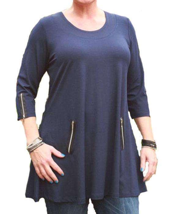 Modellen har en rund halsudskæring med en pæn bred kant. Tunikaen er med ¾ ærmer, nederst på begge ærmer er der en sølv pyntelynlås.