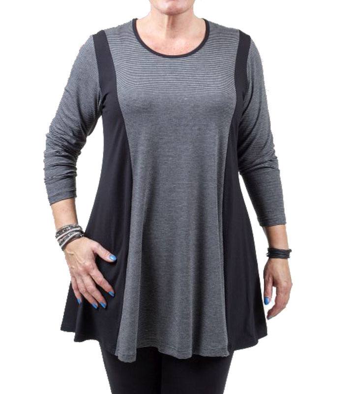 Tunikaen er med tynde sorte og grå striber og panelerne samt halsrundingen er sorte.
