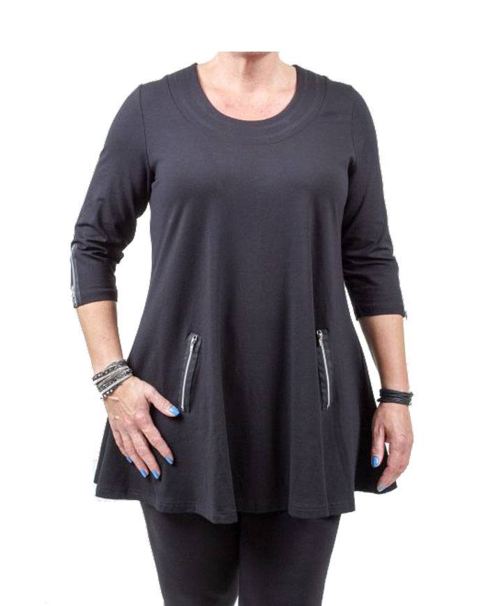 Modellen har en rund halsudskæring med en pæn bred kant. Tunikaen er med ¾ ærmer, nederst på begge ærmer er der en sølv pyntelynlås.